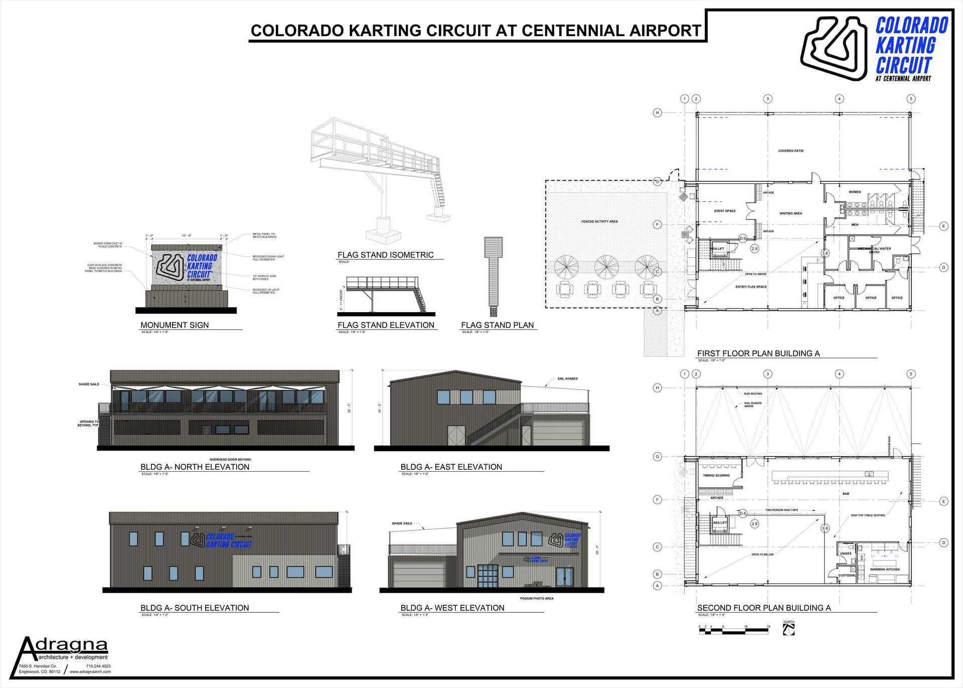 A 2-story, 5,300 sq. ft. main building with reception, food service, event space (indoor & outdoor), arcade, restrooms, a viewing deck, and a covered kart grid.